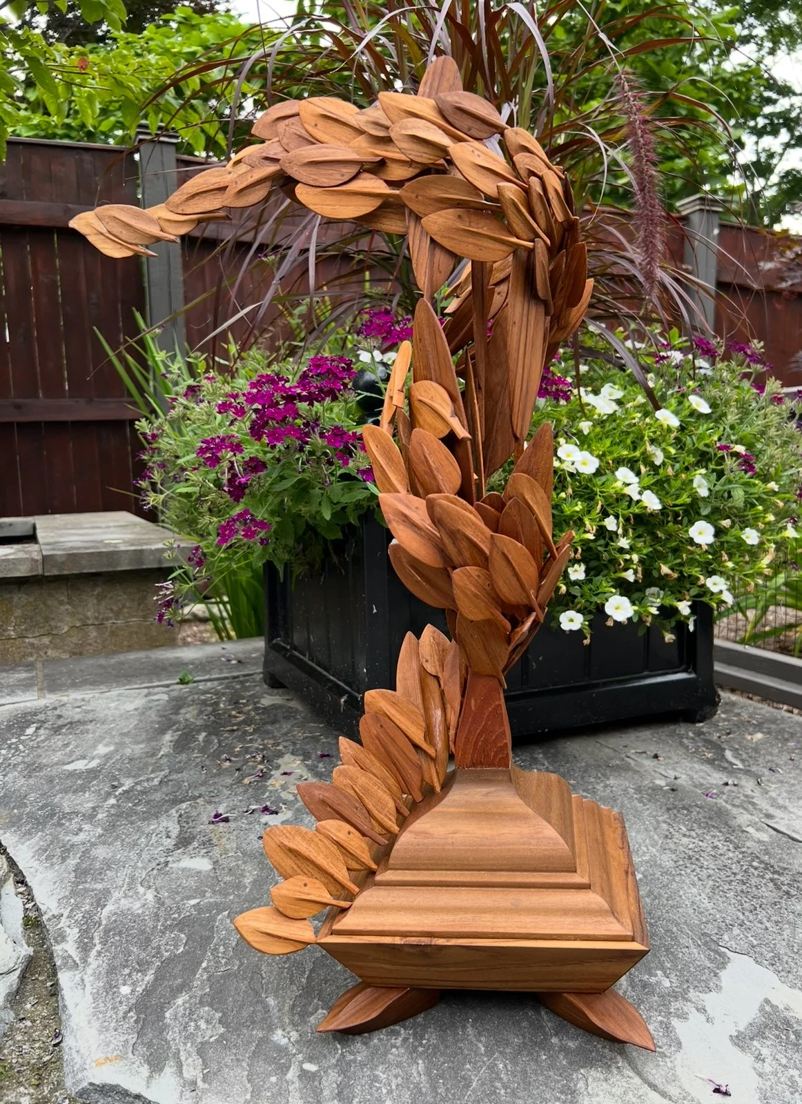 All Teak, non-functional sculpture. each feather hand carved, sanded and pieced together using hand carved dowels of the same wood.